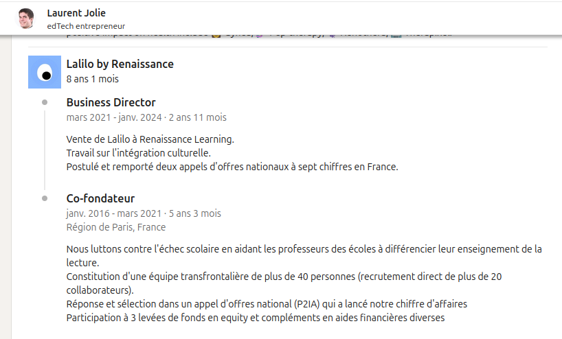Laurent Jolie, un des deux co-fondateurs, n’en est pas à son coup d’essai. En 2016, déjà, il avait co-fondé une autre EdTech, Lalilo. Un an plus tard, la jeune pousse faisait partie des lauréats du premier P2IA. L’entrepreneur ne s’en cache pas sur son compte LinkedIn, indiquant explicitement que cette subvention a “lancé notre [leur] chiffre d’affaires”. Il indique par la suite qu’en tant que “Business Director”, il a “postulé et remporté deux appels d’offres nationaux à sept chiffres en France”. En 2021, sa start-up est revendue à un groupe américain, Renaissance.